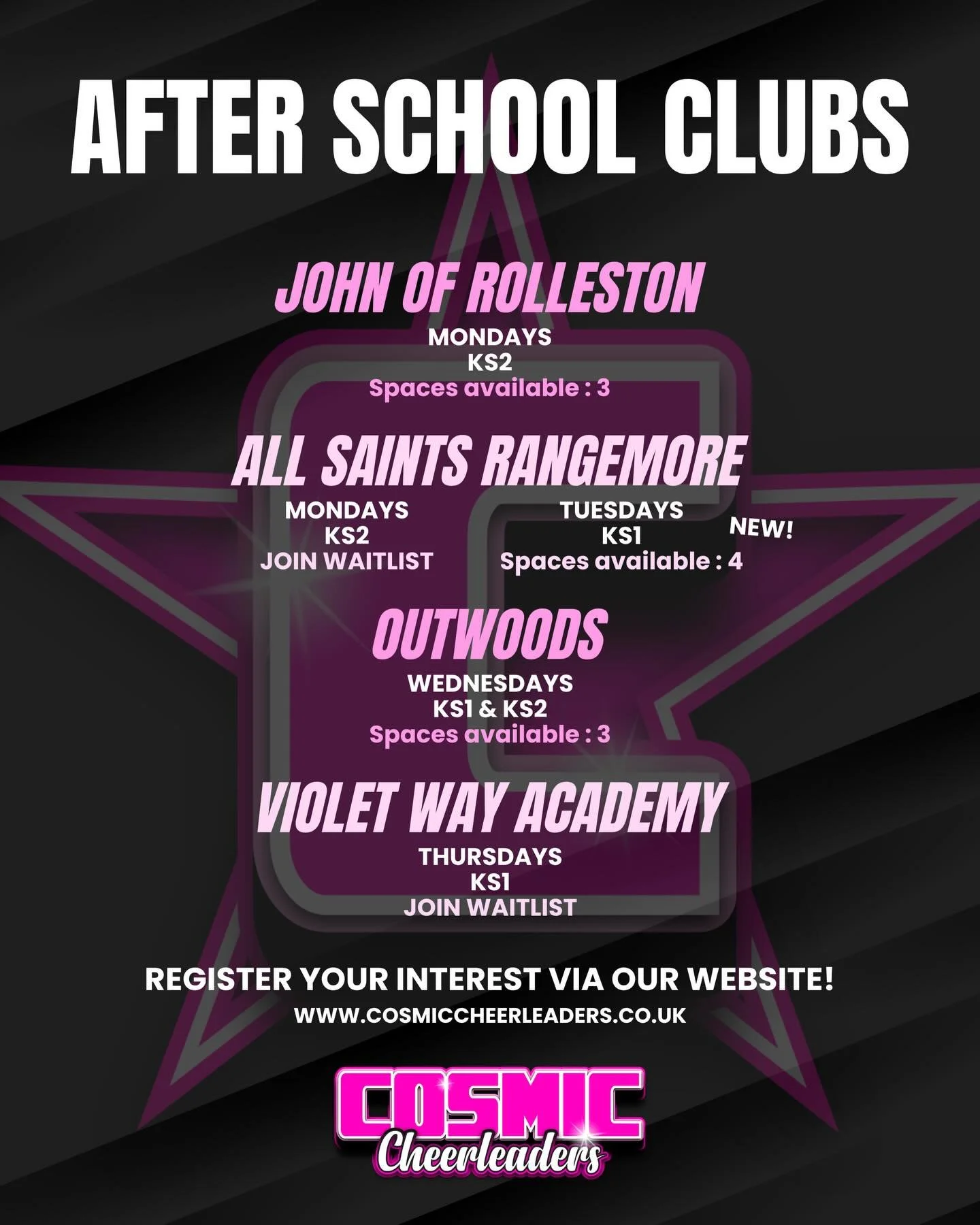 Based in Burton on Trent, Cosmic Cheerleaders offers programs for athletes aged 4+ of all abilities, including Recreational Classes, Competitive Teams, our Tumbling Academy, Competition Development Team, and International Travel Team. We also run an Educational Programme, teaching cheer in schools and after-school clubs across the Midlands. Our recent trip took us to Disneyland Paris, and this summer weβre heading to the European Championships in Barcelona!